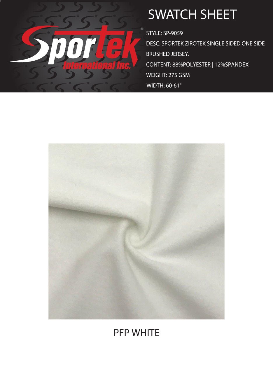 SP-9059 Sportek ZiroTek Single sided One side Brushed Jersey - PFP White / Yard is backordered and will ship as soon as it is back in stock.