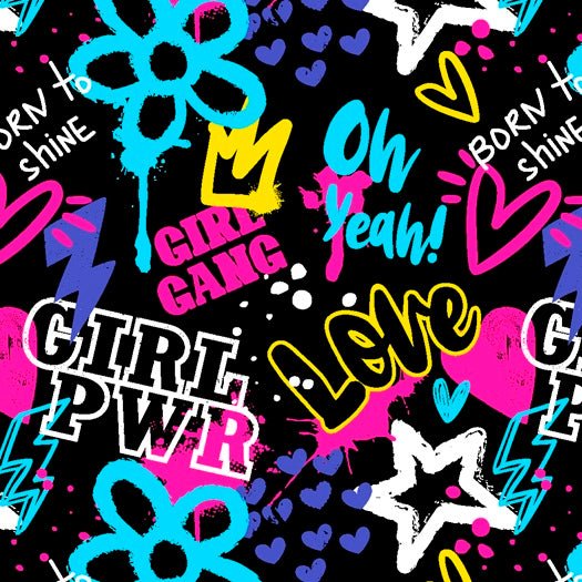 Let your personality shine with our Girl Power collection! This vibrant spandex features graffiti-style motifs like hearts, lightning bolts, empowering words such as "Girl PWR" and "Love" on a dark backdrop. Perfect for statement activewear, dance costumes and custom apparel, this fabric inspires confidence and empowerment while offering exceptional stretch and comfort.