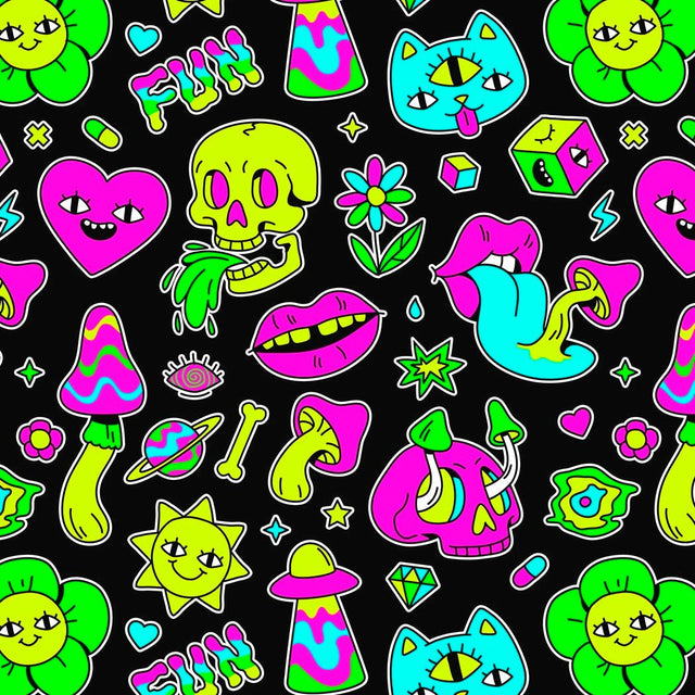 Design: Eye-catching pattern with neon icons and cheerful motifs on a dark base for a striking, youthful look.