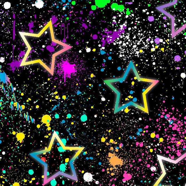 Multicolor Neon Stars and Paint Splatter Design: A dynamic mix of neon stars and energetic paint splatters on a black background.